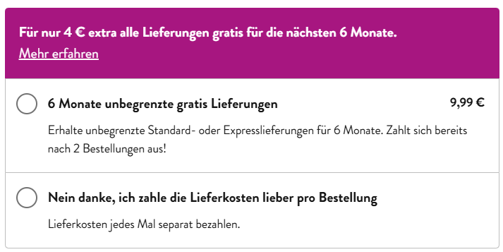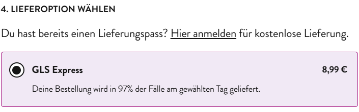 Wenn Sie ordnungsgemäß in Ihr Konto eingeloggt sind, werden die Lieferoptionen wie unten dargestellt angezeigt. So stellen Sie sicher, dass Sie Ihre Kontoprivilegien optimal nutzen und die Liefermethode auswählen können, die am besten zu Ihren Bedürfnissen passt.
